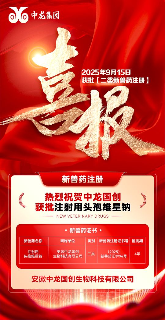 2025年9月15日,安徽中龙国创生物科技有限公司迎来重要里程碑——农业农村部发布第928号公告,根据《兽药管理条例》和《兽药注册办法》规定,经审查,安徽中龙国创生物科技有限公司研发的国家级新兽药“注射用头孢维星钠”正式获批!这是中龙国创在抗生素领域的一项重大成果,标志着公司在创新药物研发和产业化道路上迈出了坚实的一步。